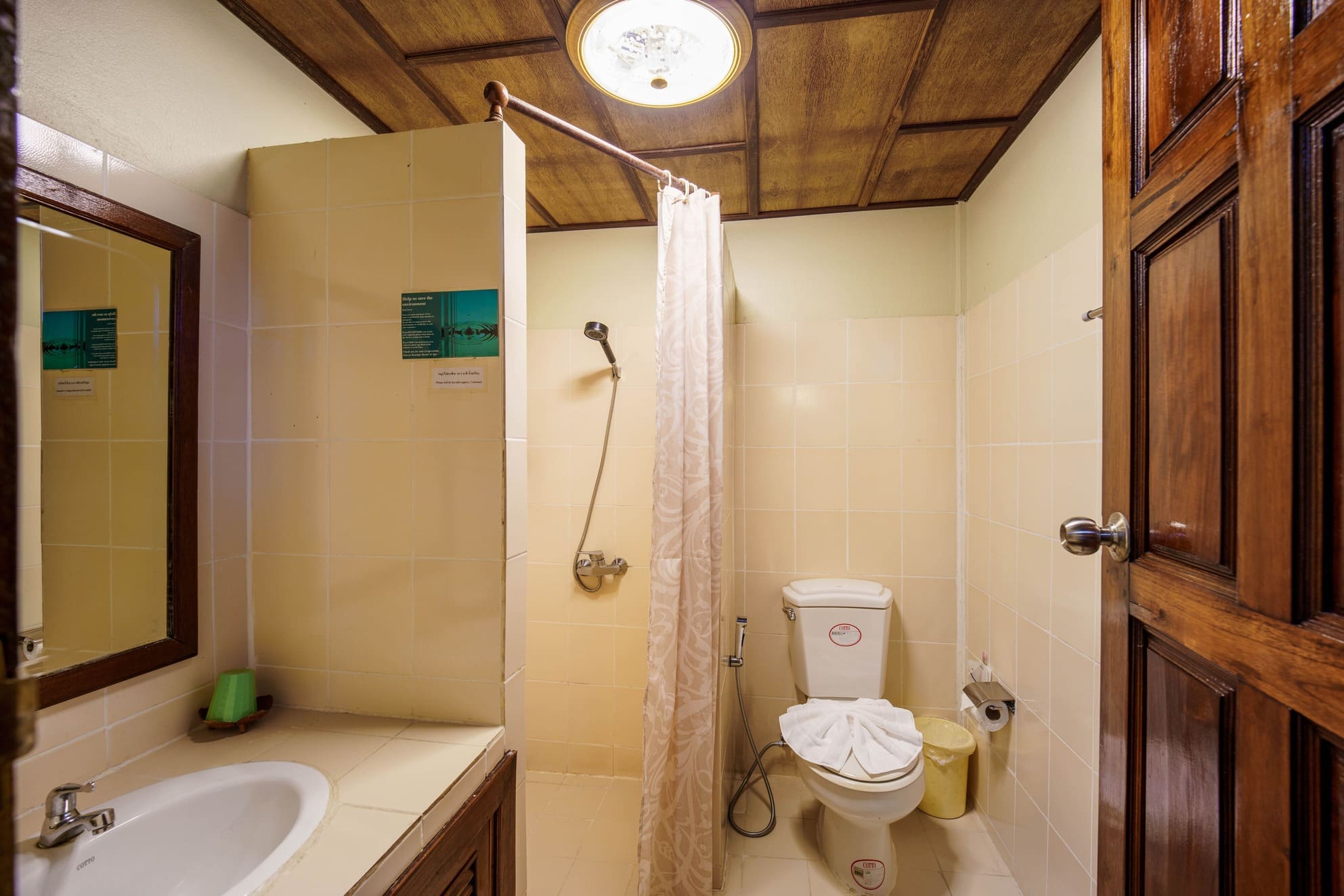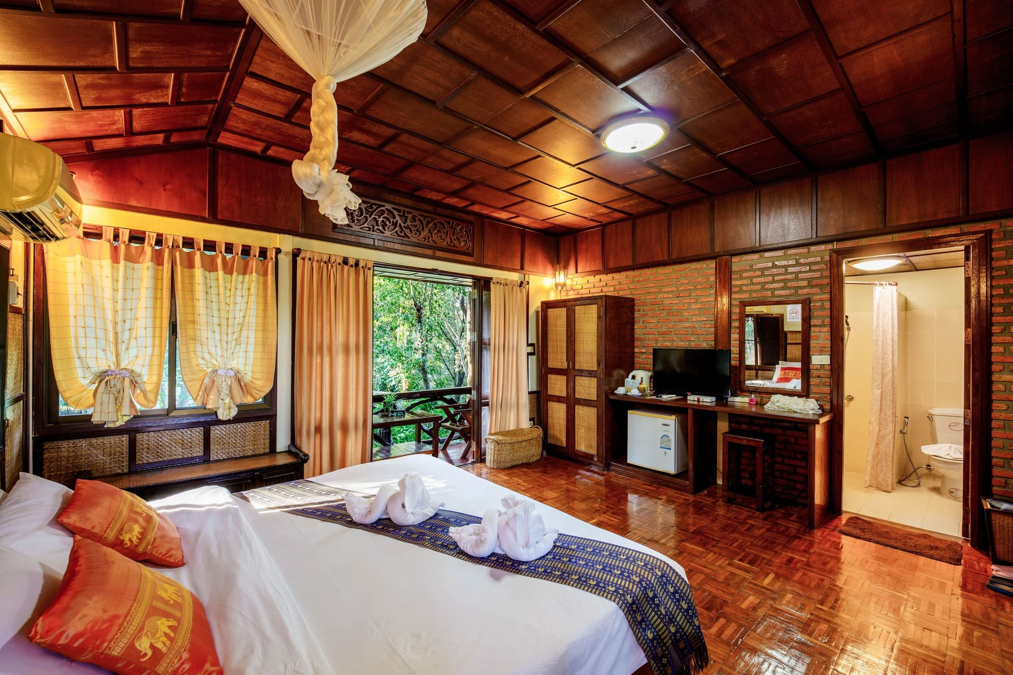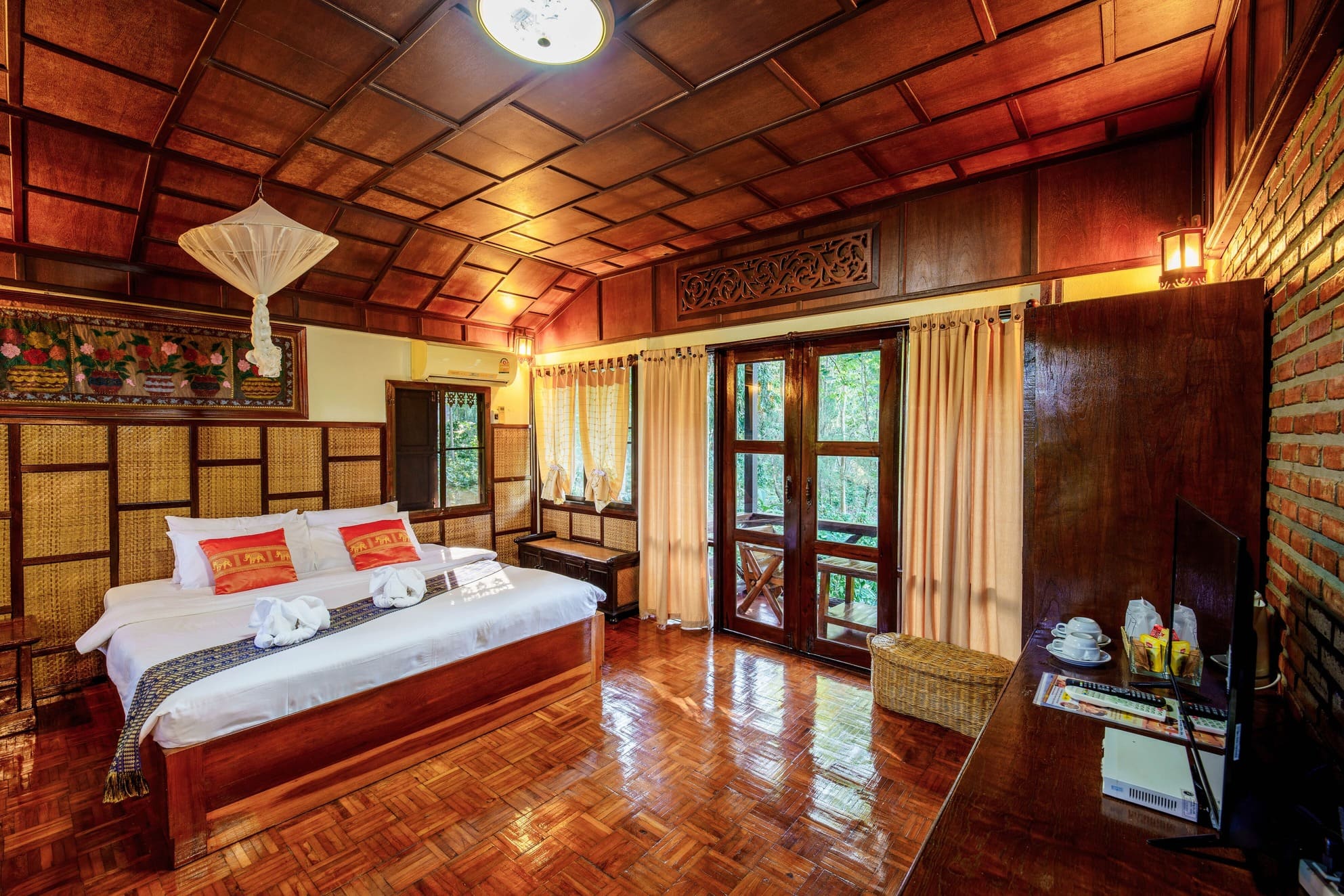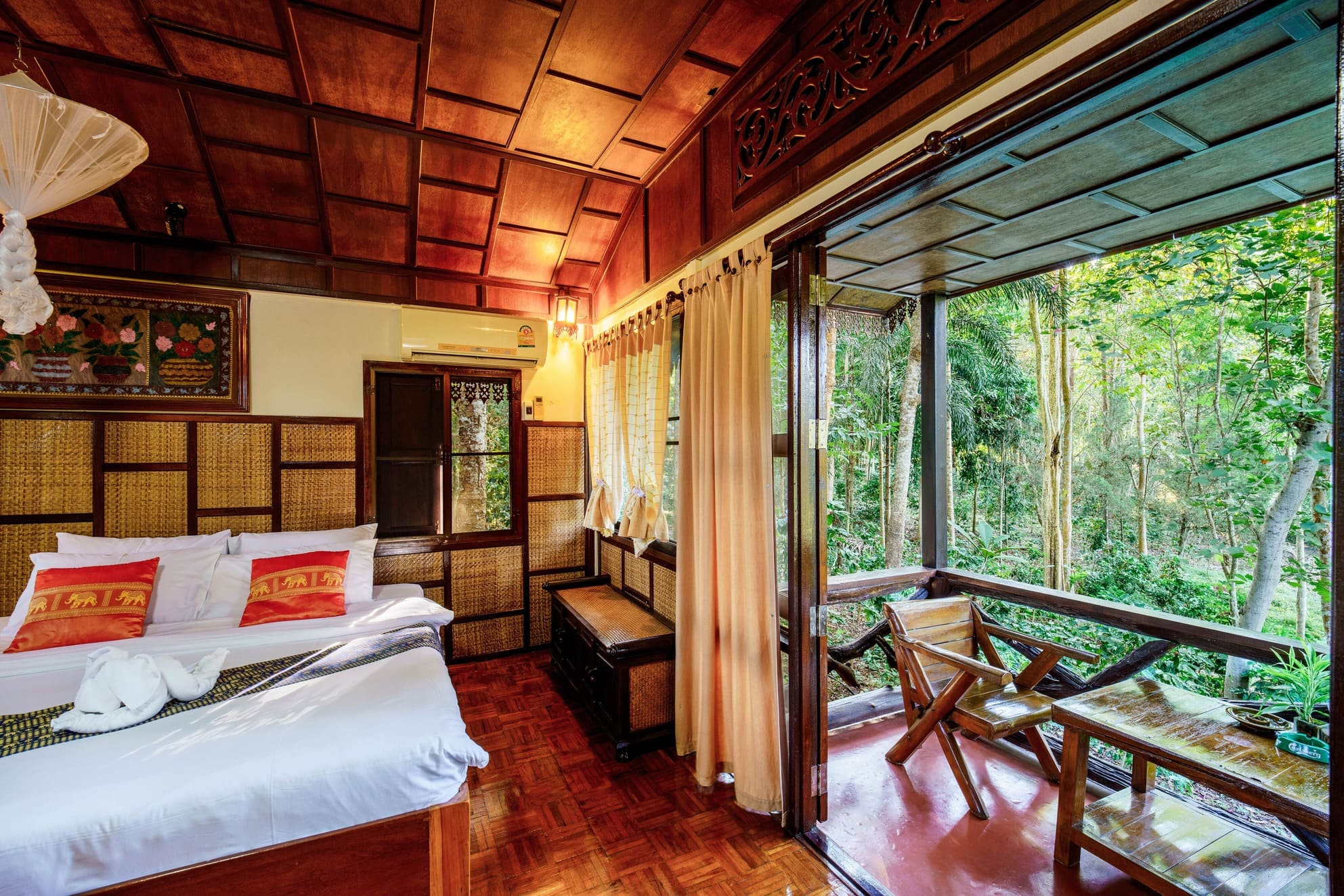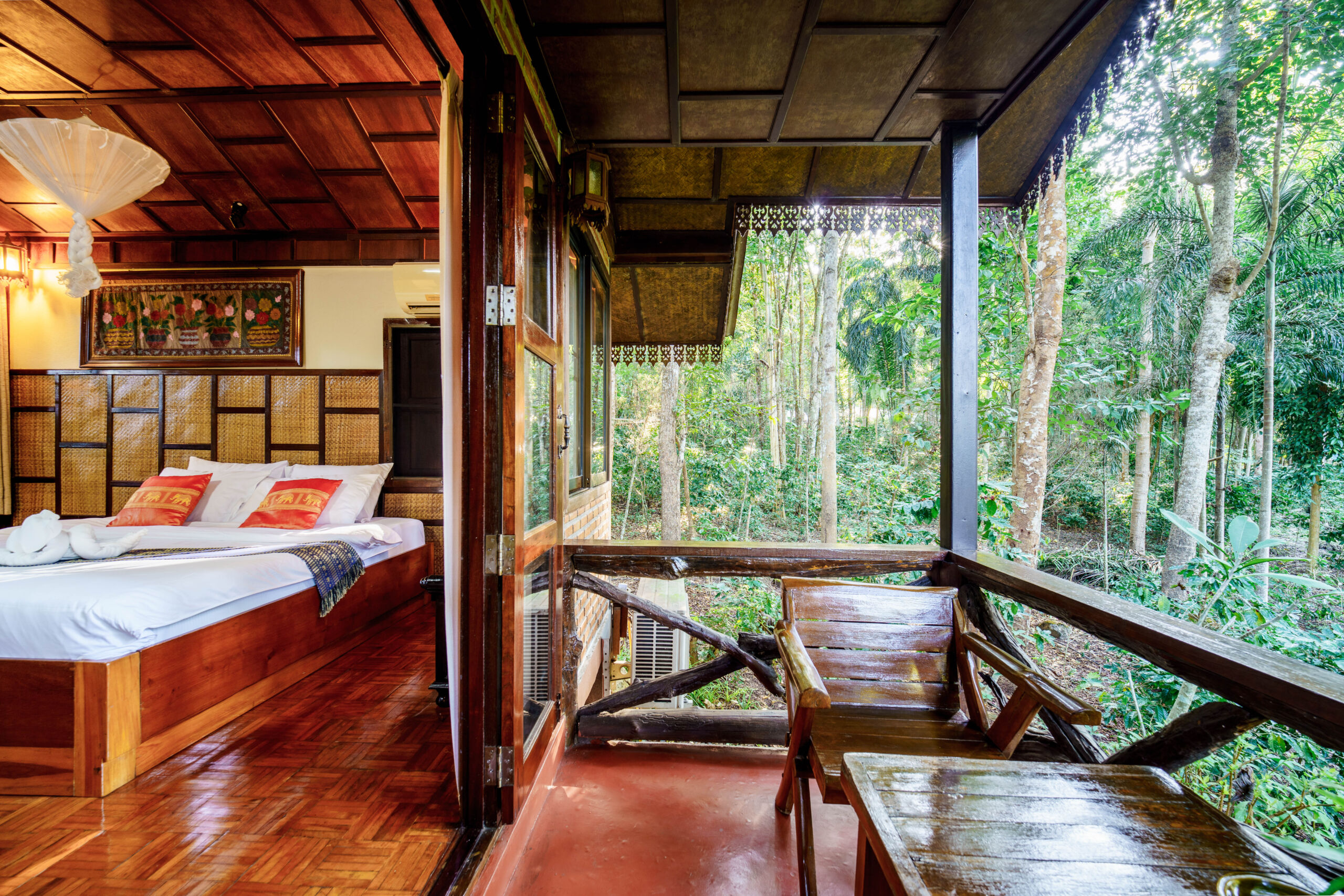 Enjoy a restful night’s sleep on a grand wooden bed, elegantly decorated with vibrant Thai-patterned cushions and bed runners.