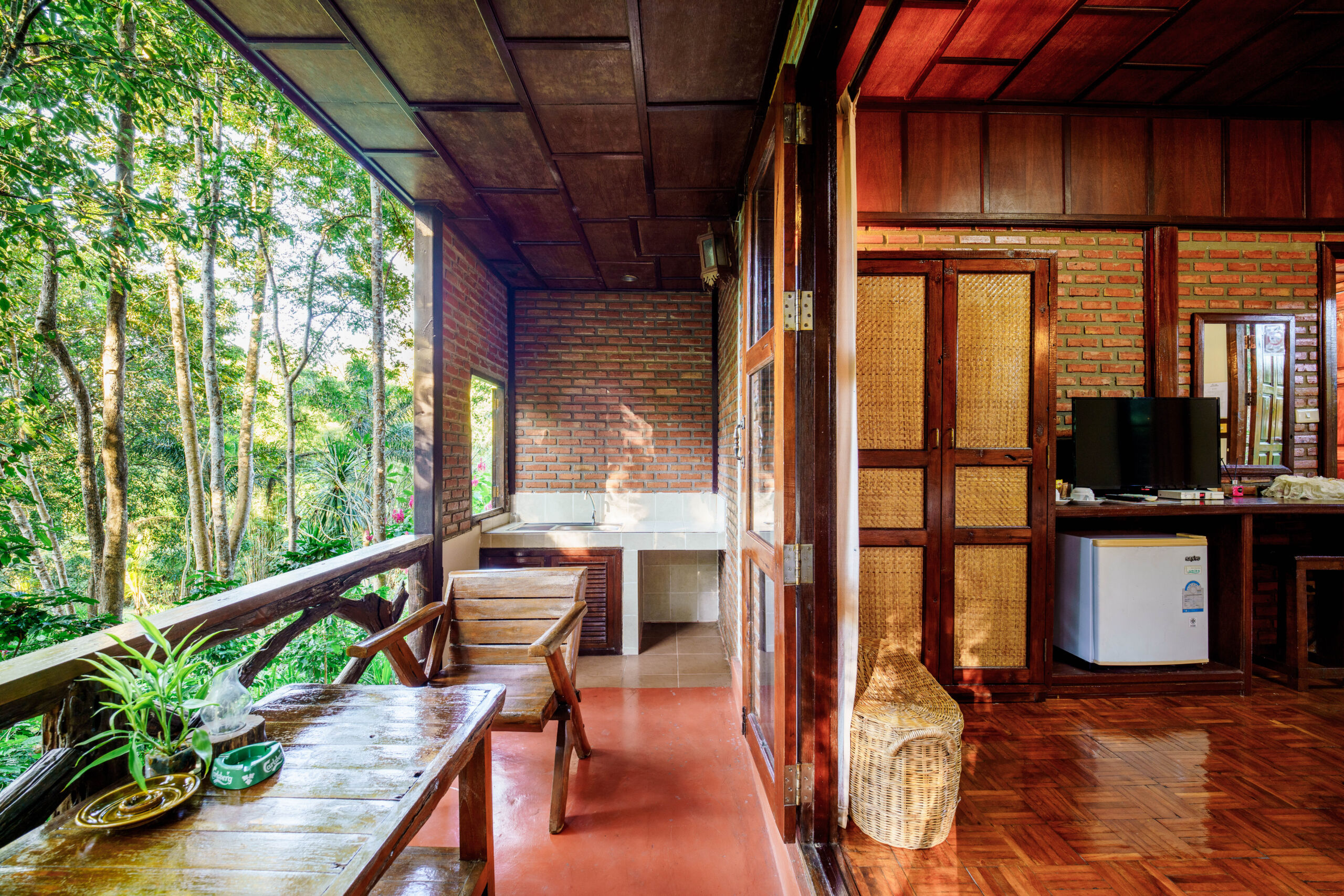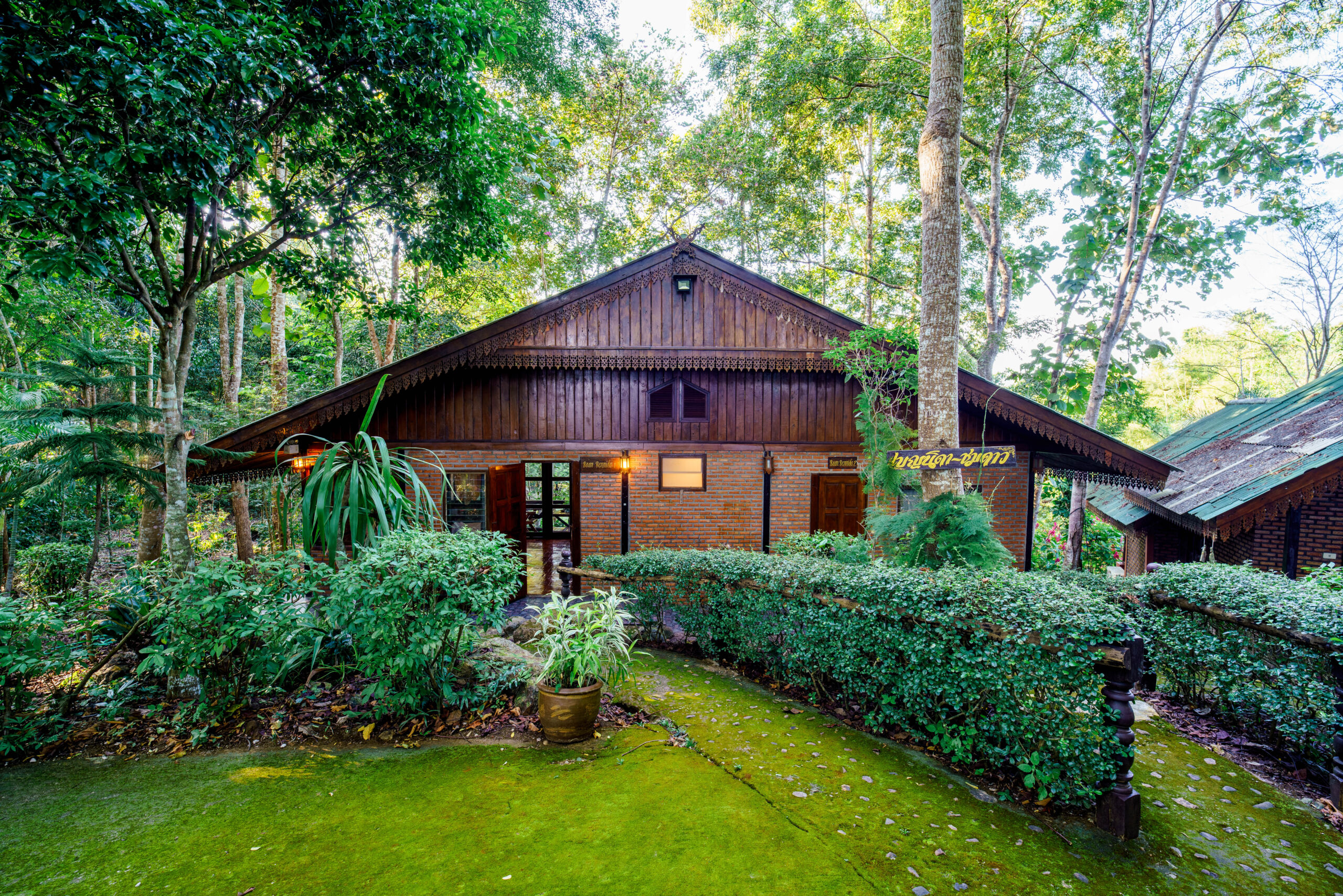 The bungalow features a striking combination of dark wood and exposed red brick, adorned with intricate Thai-style carved eaves for a touch of local elegance.