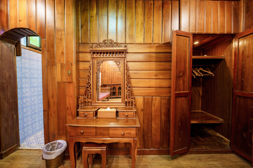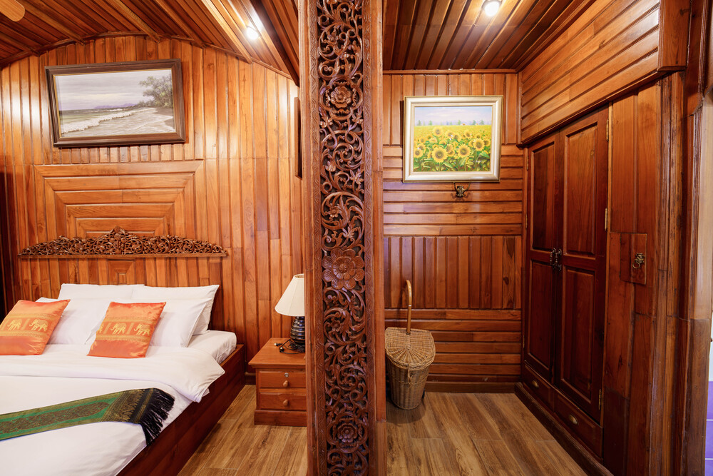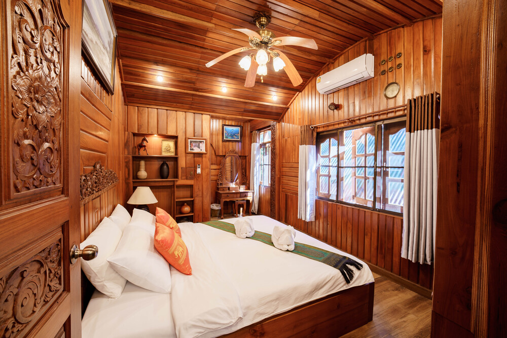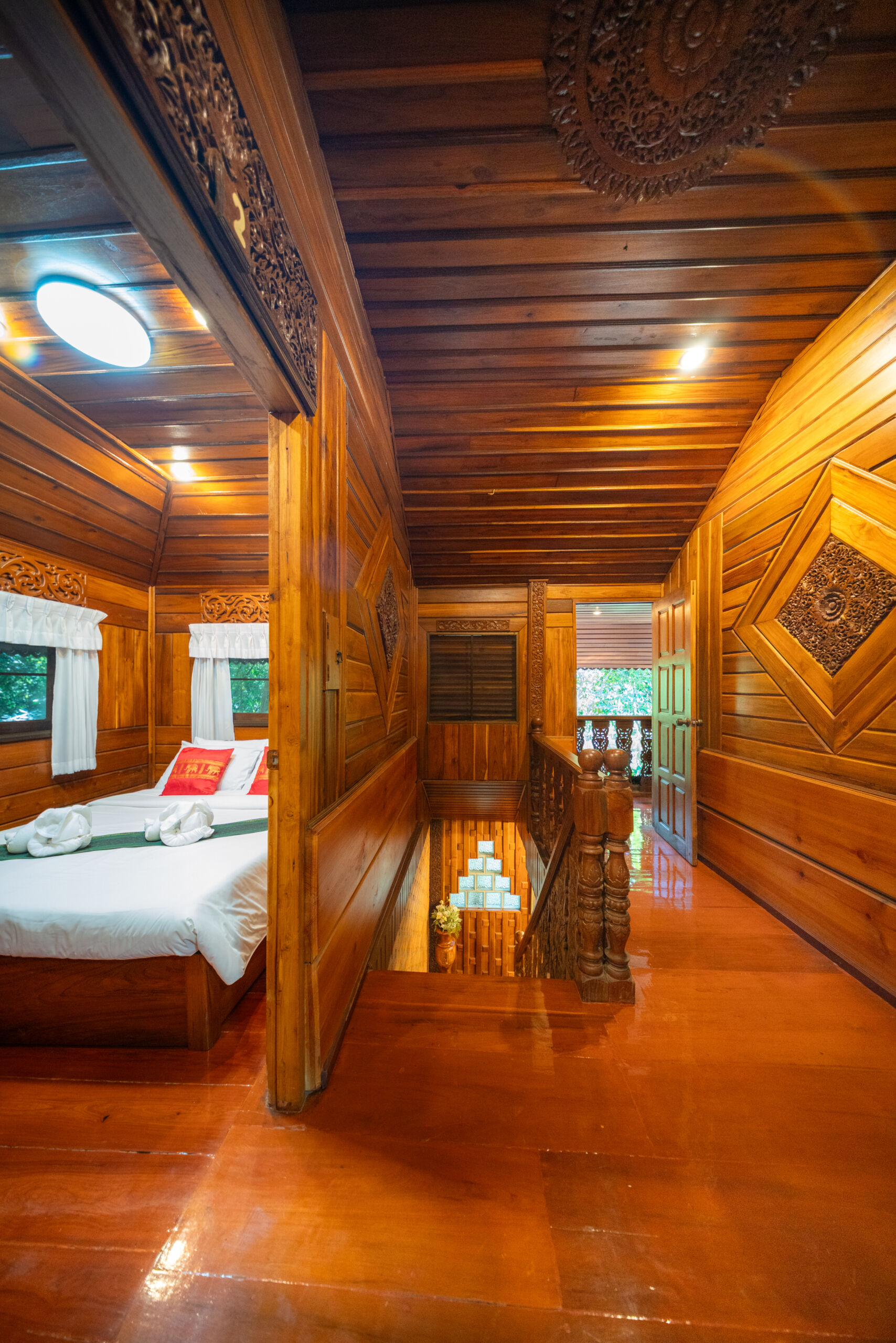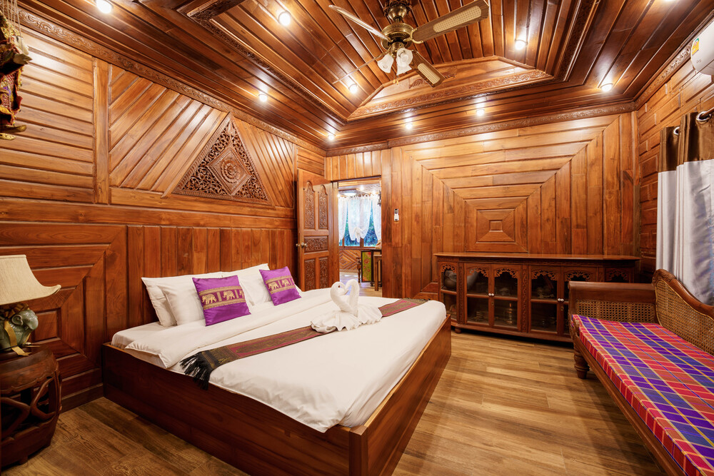 Spacious bedrooms appointed with classic wooden furniture, high-quality linens, and curated Thai artwork, ensuring a restful and luxurious retreat.