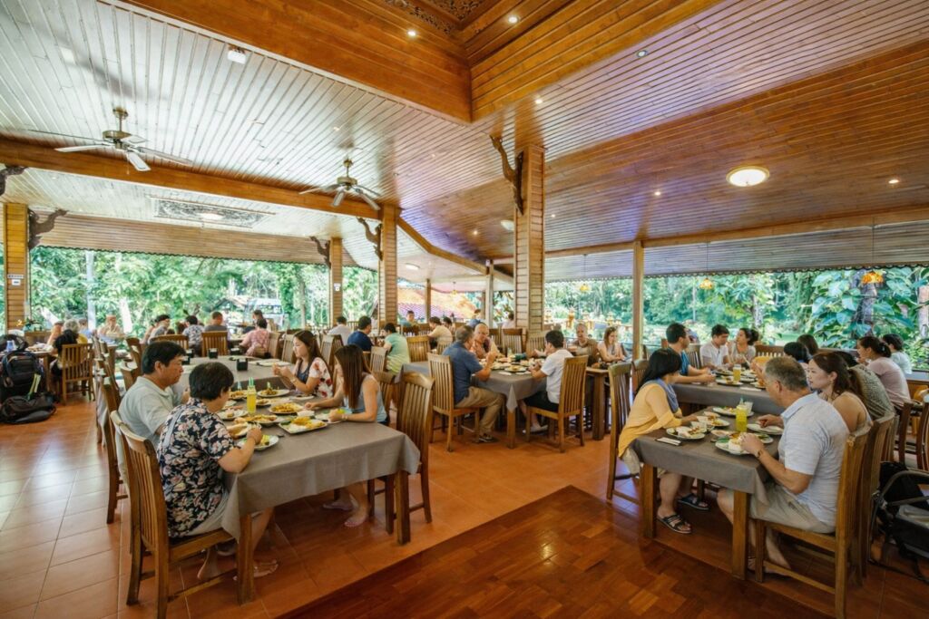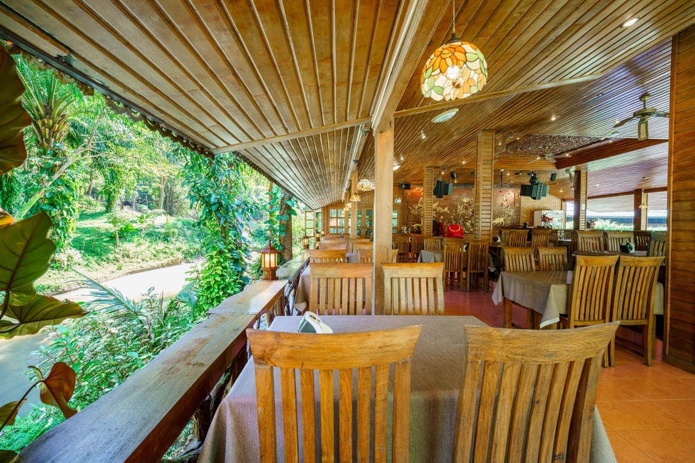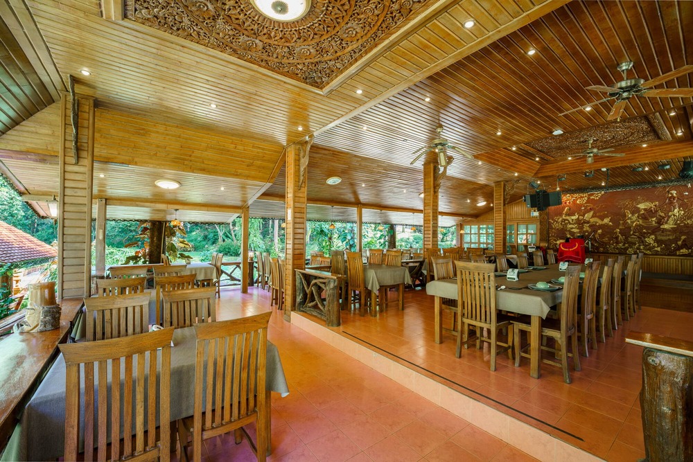 Dine in a magnificent teakwood pavilion that offers breathtaking views of the lush garden and forest, creating a perfect blend of artistic culture and natural serenity.