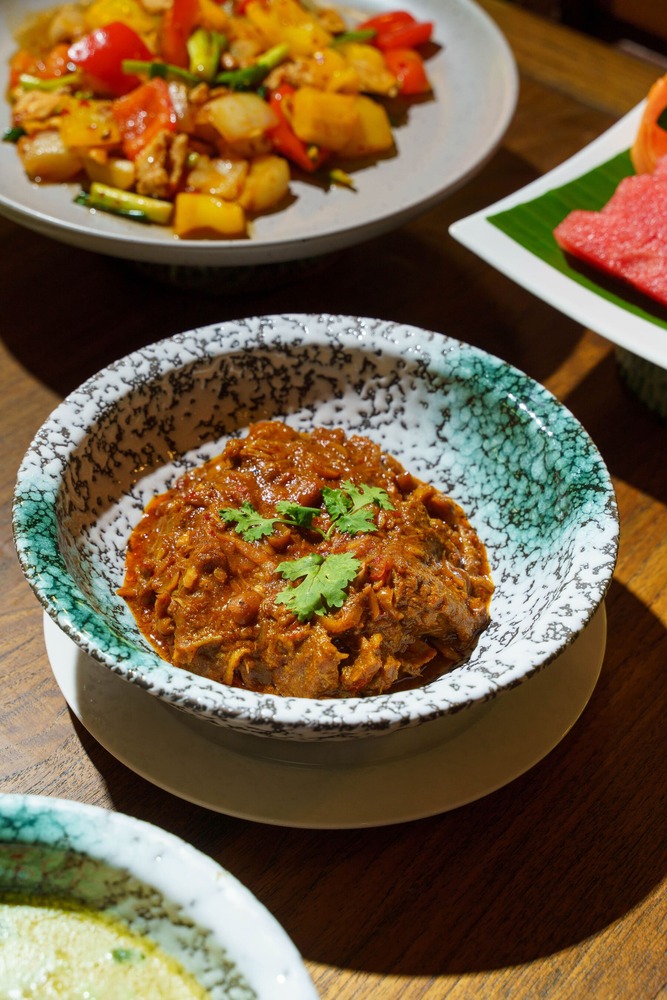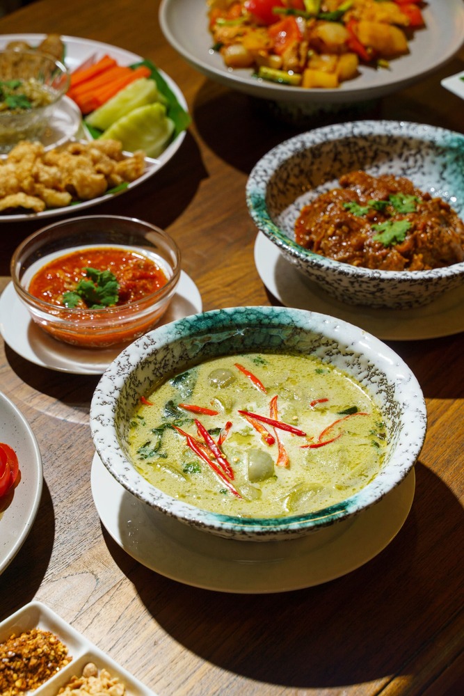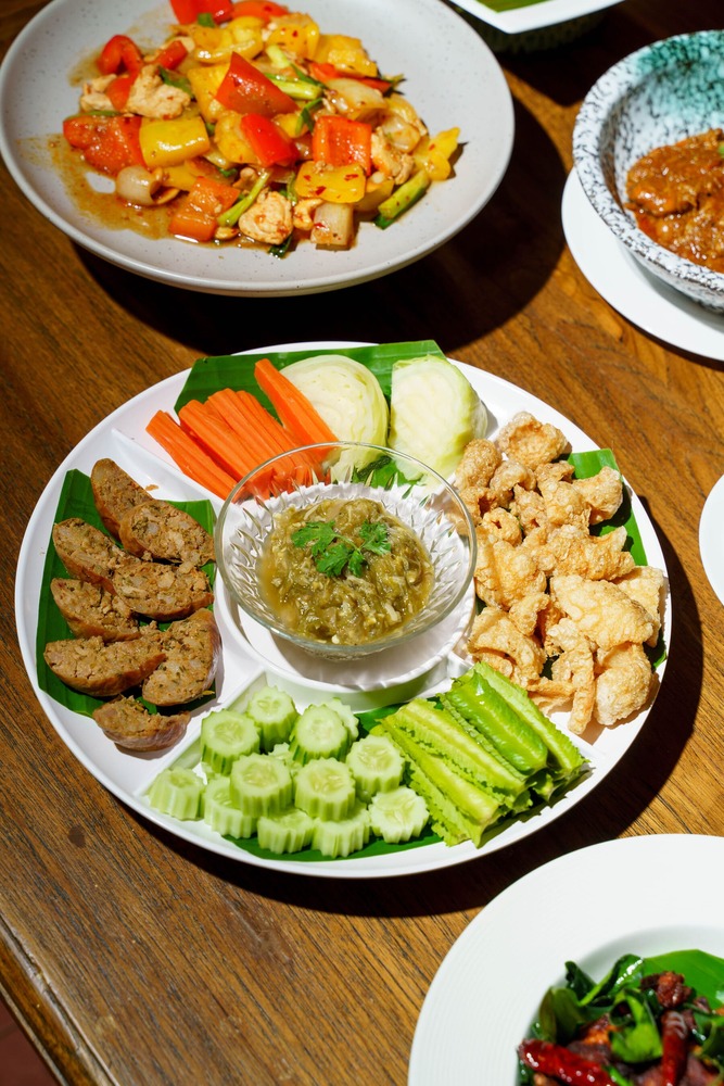 These signature dips are served alongside an abundant selection of traditional accompaniments, including crispy pork crackling, fragrant herb-filled Northern Thai sausage (Sai Oua), and freshly selected local vegetables. Another must-try dish is Gaeng Hung Lay, a slow-braised Northern Thai pork curry simmered until the meat becomes tender and infused with deeply aromatic spices. The menu is further complemented by stir-fried local vegetables that highlight the natural sweetness and freshness of regional ingredients.