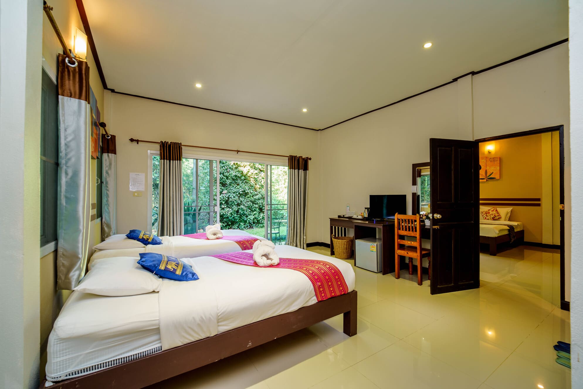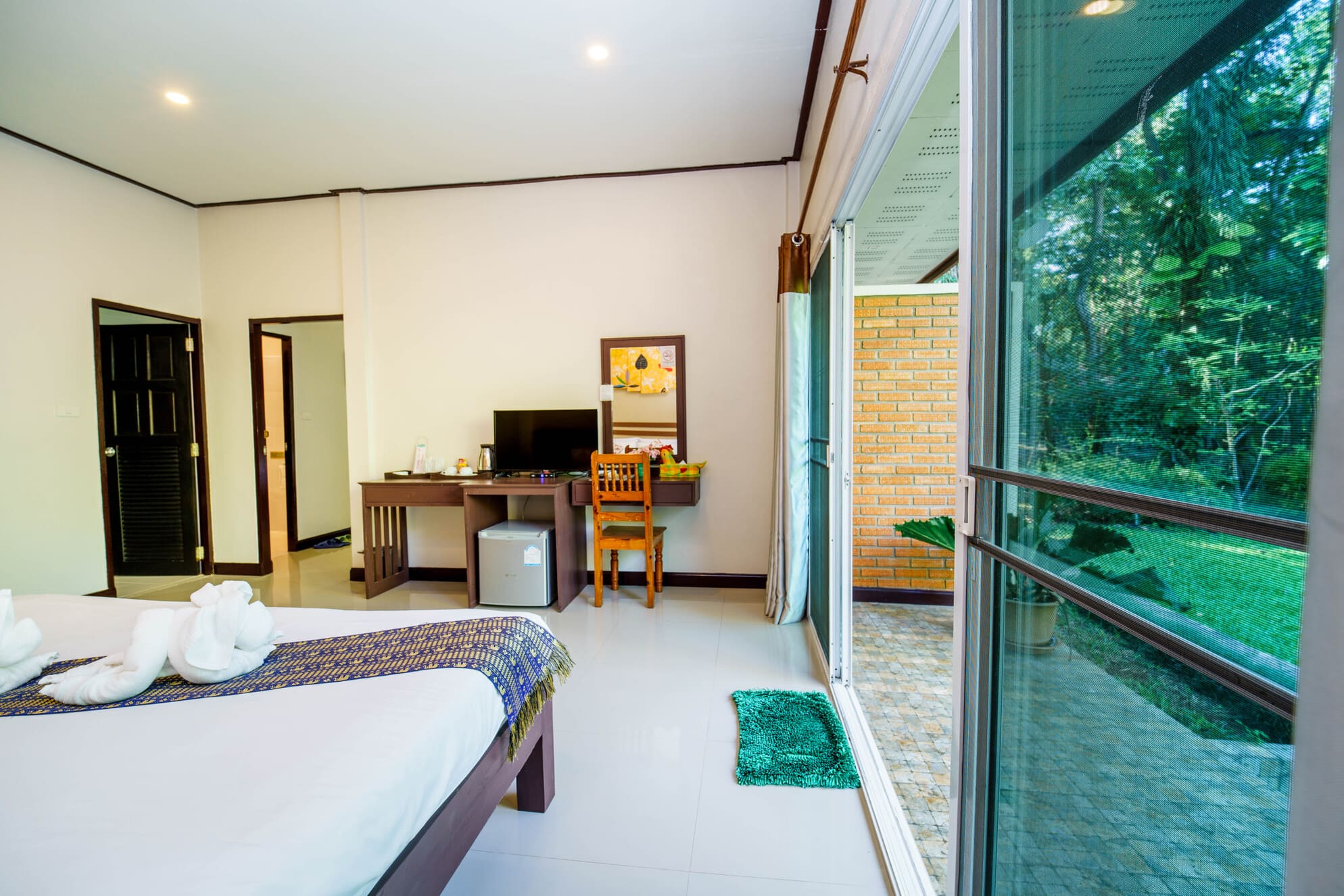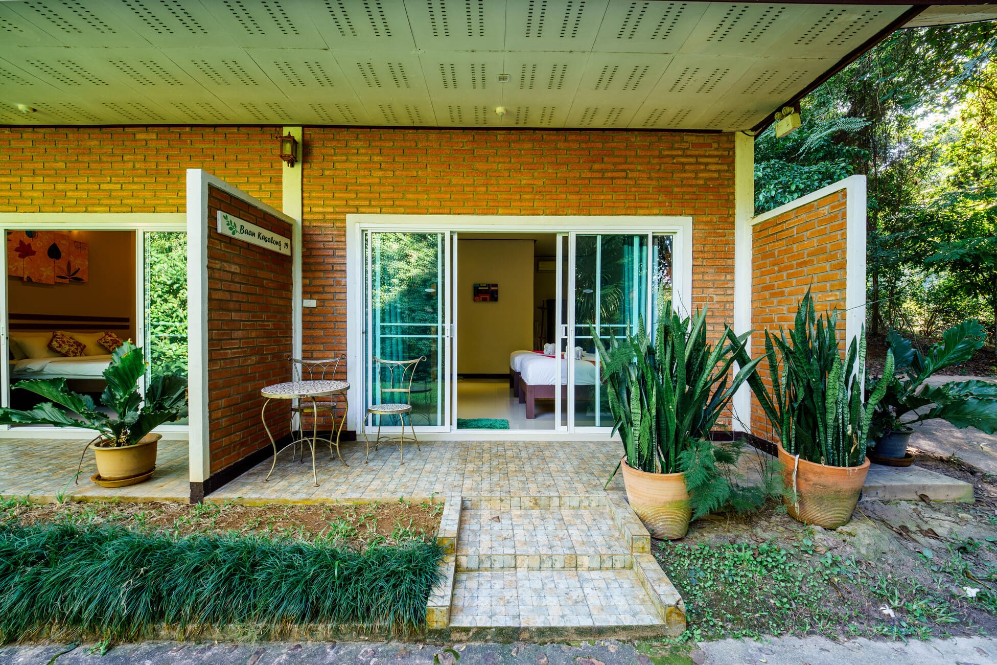The rooms are designed with a focus on light and space. Large sliding glass doors allow natural light to fill the room and offer panoramic garden views directly from your bed.