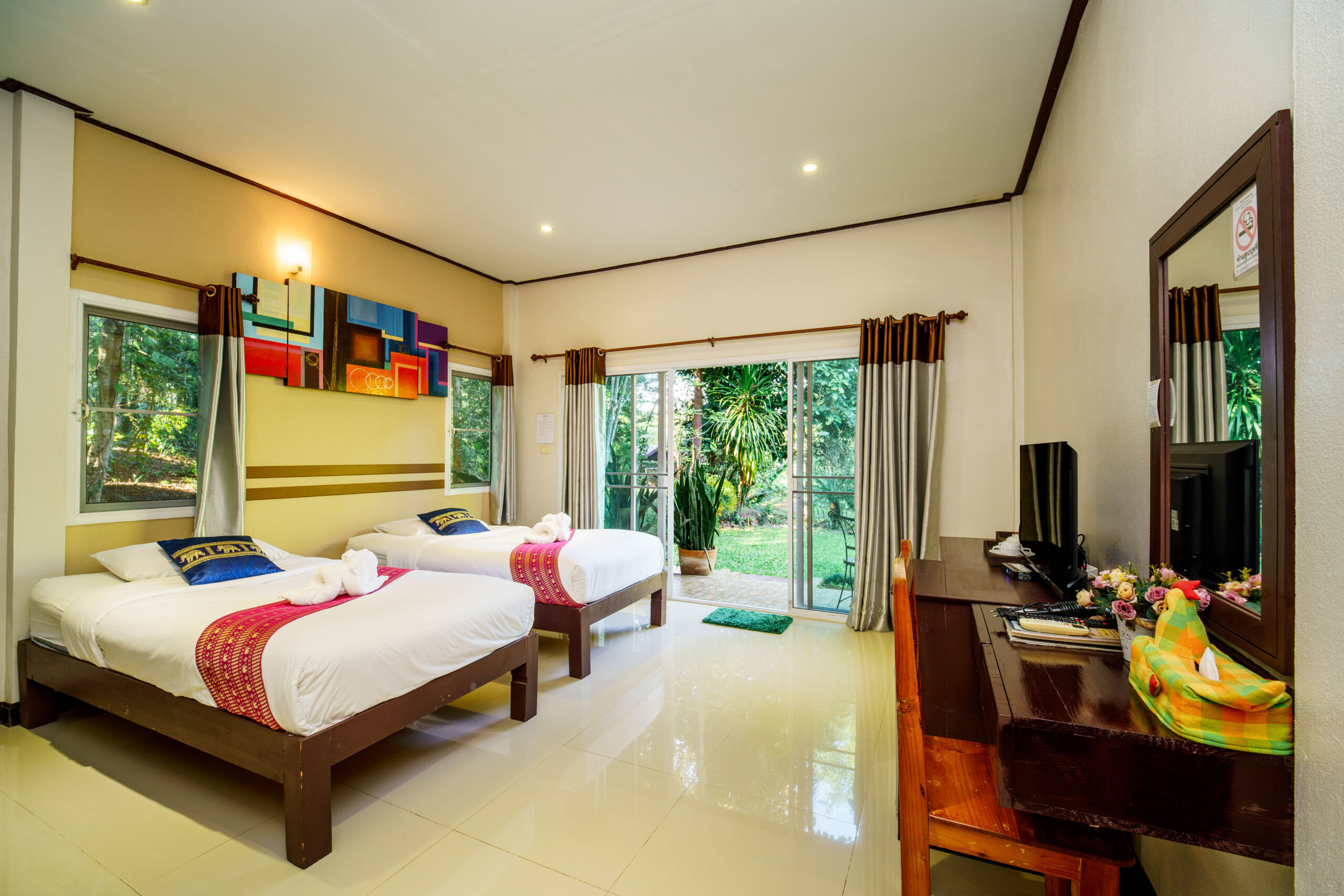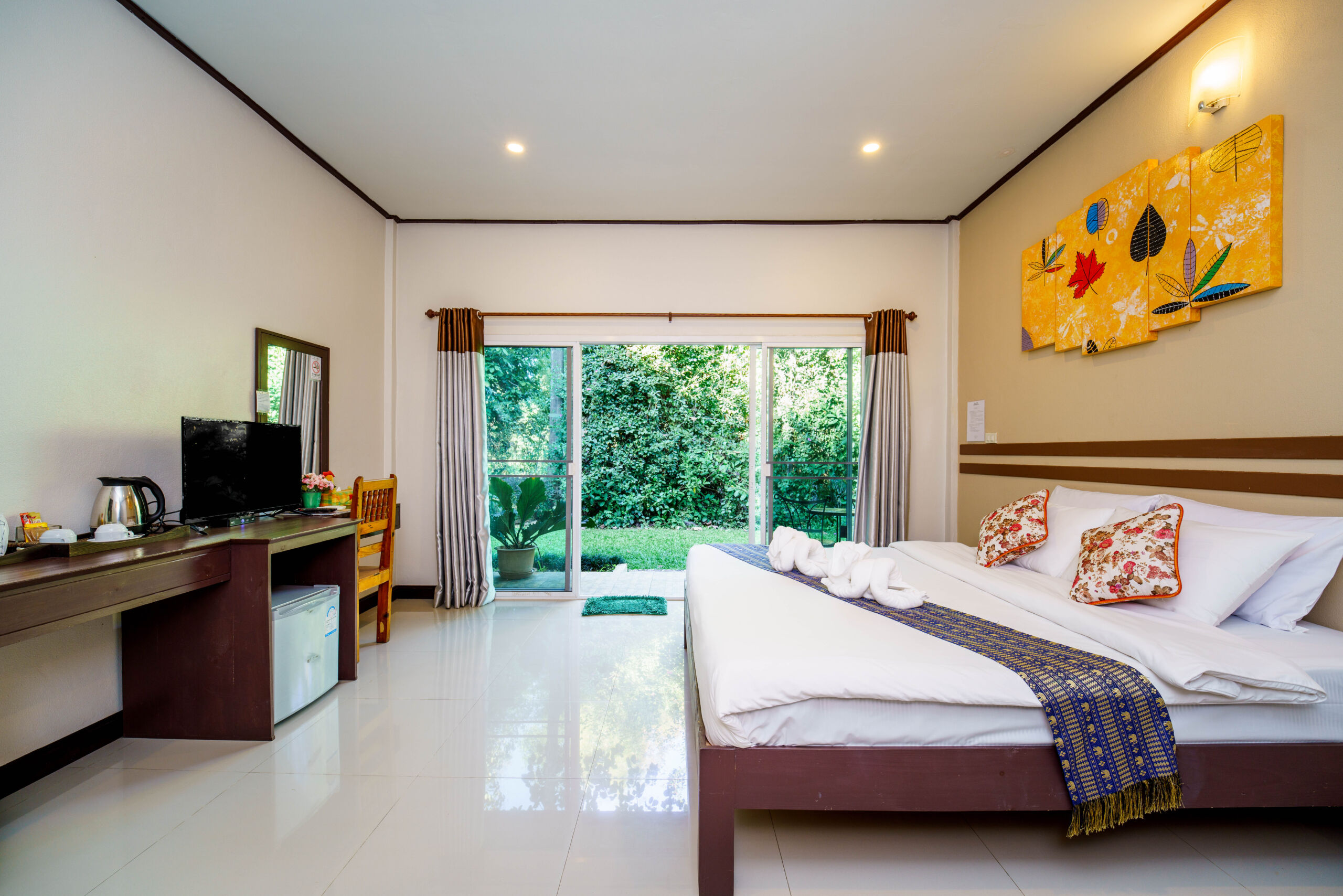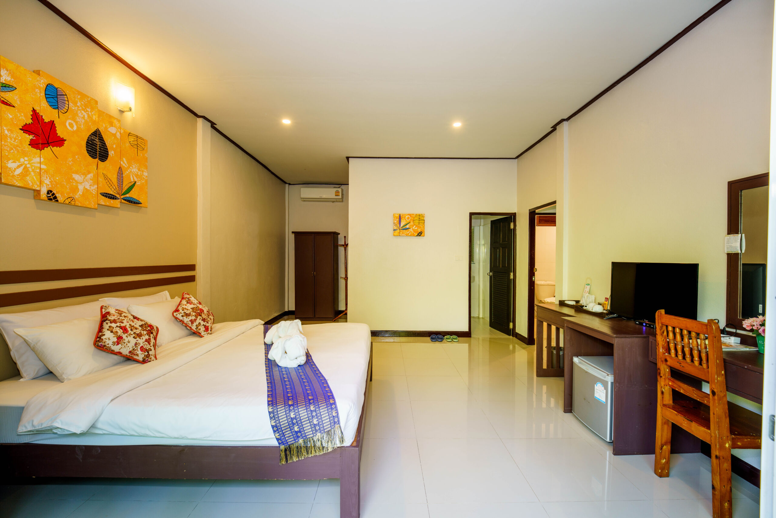 Featuring sturdy wooden beds and premium white linens, the rooms are decorated with vibrant wall art to create a cheerful and relaxing atmosphere.