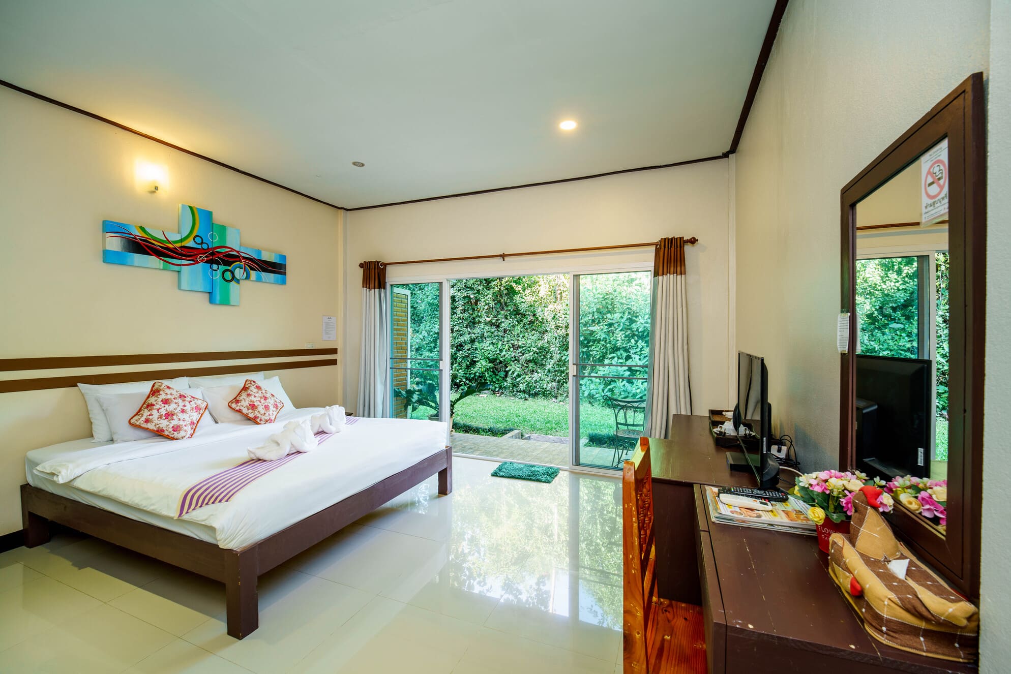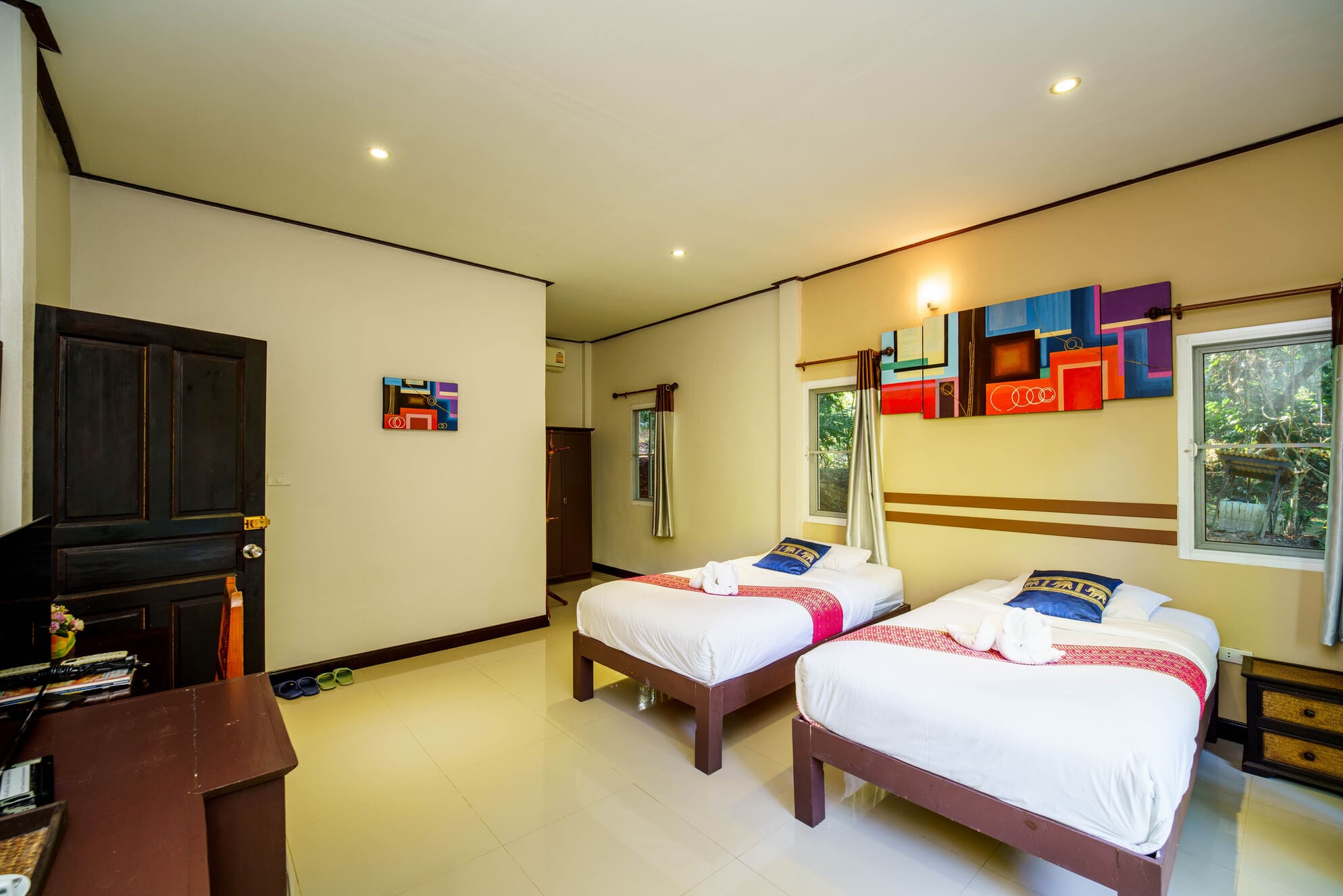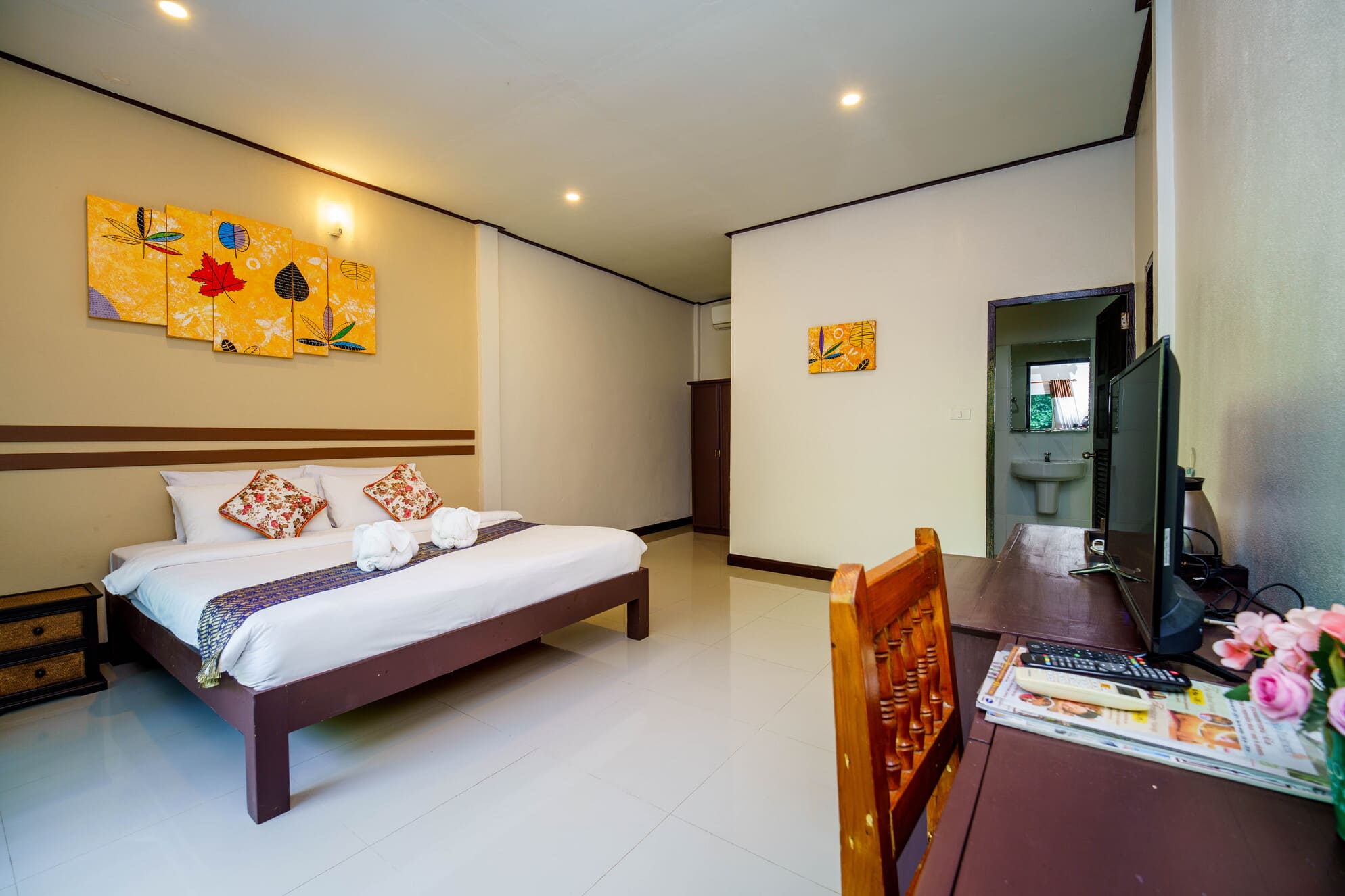 Featuring sturdy wooden beds and premium white linens, the rooms are decorated with vibrant wall art to create a cheerful and relaxing atmosphere.