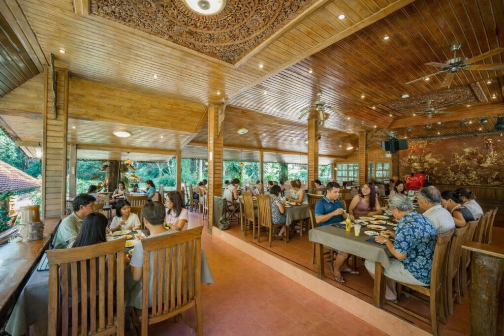 สัมผัสมื้ออาหารในบรรยากาศอบอุ่นภายในเรือนไม้ที่โอบล้อมด้วยต้นไม้นานาพรรณ ให้ความร่มรื่นและเงียบสงบ เหมาะสำหรับการนั่งพักผ่อน รับประทานอาหาร และดื่มด่ำกับธรรมชาติรอบตัวอย่างเต็มที่
